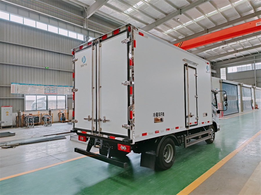 廂體采用內(nèi)外玻璃鋼材料制作,中間夾層為高密度保溫材料,用真空復(fù)合一次成型,表面光潔平整,強(qiáng)度高,使用壽命長(zhǎng),廂體邊緣采用優(yōu)質(zhì)鋁合金包邊和專用密封膠處理,具有重量輕、保溫、密封效果好等特點(diǎn)。門框鎖件為不銹鋼材質(zhì),門四周用一次成型密封條密封,廂體外形平整美觀,車廂頂部加以雨檐,避免下雨天雨水對(duì)車廂的浸泡,延長(zhǎng)廂體使用壽命,車廂內(nèi)配有人性化照明系統(tǒng)。穩(wěn)固性和氣密性是普通冷藏車廂體不可比的,并且具有質(zhì)量輕,抗沖擊力強(qiáng),無(wú)滲透等優(yōu)點(diǎn)。配備國(guó)產(chǎn)580制冷機(jī)組。